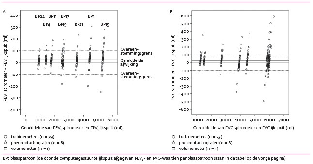 Spirometers in Nederlandse huisartsenpraktijken meten gemiddeld iets te hoge FEV1- en FVC-waarden, maar sommige apparaten vertonen aanzienlijke meetfouten.