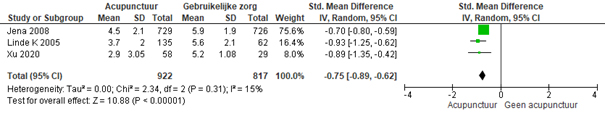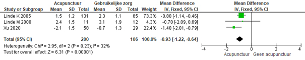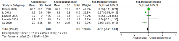 De resultaten uit de cochranereview konden met behulp van deze nieuwe RCT worden geüpdatet (zie [forest plots]). Deze update laat zien dat acupunctuur – vergeleken met de gebruikelijke zorg – na 4 maanden tot een beperkt klinisch relevante verbetering leidt op de uitkomstmaten ‘aanvalsfrequentie van de migraine’ (3 RCT’s; n = 306; gemiddeld 0,93 aanvallen minder per maand; 95%-BI -22 tot -0,64) en ‘hoofdpijnintensiteit’ (3 RCT’s; n = 1739; SMD -0,75 lager; 95%-BI -0,89 tot -0,62). Een verschil van 0,75 wordt wordt als een beperkt klinisch relevant effect beschouwd.