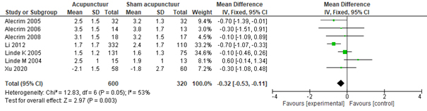 Analyse 3 | Uitkomstmaat Aanvalsfrequentie, 4 maanden na randomisatie (vergelijking: acupunctuur versus ‘sham’ acupunctuur)