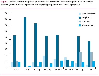De leeftijd is een belangrijke voorspeller van de uiteindelijke diagnose. In de leeftijdsgroep 25 tot 44 jaar is de einddiagnose van alle patiënten die met benauwdheid bij de huisarts komen bij 54% respiratoir van aard. Bij 13% gaat het om een paniekstoornis en bij vrijwel niemand is er sprake van een cardiale oorzaak.2 Bij patiënten ouder dan 75 jaar neemt de kans op een cardiale oorzaak toe tot 25% [figuur]. De indruk bestaat dat op een huisartsenpost de incidentie van acute ernstige oorzaken hoger is door selectie. Hierover zijn in de literatuur geen onderzoeksgegevens te vinden. Bij de triage is het van belang om signalen van respiratoire insufficiëntie te herkennen en te onderscheiden van niet-levensbedreigende vormen van benauwdheid.3 Ernstige dyspneu kan de doktersassistente via de telefoon vaststellen doordat de patiënt vrijwel niet kan spreken. Andere alarmsymptomen bij benauwdheid die omstanders of medisch personeel kunnen vaststellen zijn het blauw of wit wegtrekken van de huid (cyanose, shock), hijgen (gebruik van hulpademhalingsspieren), een sterk versnelde ademhalingsfrequentie (meer dan 30-40/minuut), bijgeruisen (piepen, rochelen) of bewustzijnsverlies. Bij de anamnese is vooral de vraag van belang of de patiënt de klachten eerder heeft gehad en of er aanwijzingen zijn voor een pulmonale, cardiale of psychiatrische aandoening. Bij het lichamelijk onderzoek zal de huisarts de benauwdheid proberen te objectiveren door inspectie, percussie en auscultatie van de longen en het hart. Bij afwijkende bevindingen in de anamnese of bij het lichamelijk onderzoek moet de huisarts een somatische verklaring van de benauwdheid overwegen. De differentiële diagnose bij acute kortademigheid is uitgebreid en omvat onder andere pneumonie, pneumothorax, longembolie, hartfalen, acuut coronair syndroom, ritmestoornis en aneurysma aortae. Bij afwijkingen die kunnen wijzen op een levensbedreigende aandoening moet de huisarts onmiddellijk nadere diagnostiek (laten) verrichten of verwijzen voor specialistisch onderzoek en behandeling. Daarbij gaat het om verschijnselen als ernstige dyspneu met intrekkingen, tachypneu, afwijkende percussie of auscultatie van de longen, hevige pijn op de borst, cyanose, hypotensie, bradycardie of tachycardie. Hypoxie kan men met eenvoudig aanvullend onderzoek vaststellen – bij een meting van de zuurstofsaturatie met pulsoximetrie duidt een saturatie van minder dan 90% op ernstige hypoxie. Een hogere of zelfs een normale saturatie (> 96%) sluit echter potentieel ernstige aandoeningen niet uit, zoals een kleine longembolie of een paroxysmale ritmestoornis. Indien men bij de anamnese en het lichamelijk onderzoek geen aanwijzingen vindt voor een organische verklaring van de benauwdheid, dan is de negatief voorspellende waarde hiervan hoog. Dat wil zeggen dat de kans groot is dat er geen ernstige somatische afwijking aanwezig is.3 In dat geval is ook de aanvullende diagnostische waarde van een X-thorax of een ecg beperkt. Met het stijgen van de leeftijd neemt de kans op een cardiale oorzaak echter toe en daarmee stijgt ook de positief voorspellende waarde van aanvullend onderzoek.