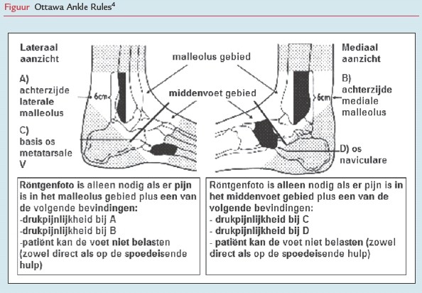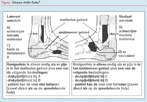 Jaarlijks krijgen ruim 600.000 mensen in Nederland een traumatisch enkelbandletsel. Daarmee is dit de meest voorkomende blessure in het bewegingsapparaat. 1 De helft van deze mensen gaat naar de huisarts of de eerstehulpafdeling van een ziekenhuis. 2 In de afgelopen decennia was de behandeling van enkelletsel regelmatig onderwerp van discussie. Nog niet zo lang geleden was immobilisatie of een operatie van enkelbandrupturen algemeen geaccepteerd. Eind jaren ’80 werden verschillende functionele behandelingen geïntroduceerd. We kennen in Nederland inmiddels drie richtlijnen over enkelbandletsel, die op hoofdpunten overeenkomen. 123 Twee daarvan zijn enigszins gedateerd. 23 Immobilisatie en operatie zijn als behandelopties naar de achtergrond verschoven. Ondertussen is nog onduidelijk hoe we de ernst van enkelbandletsel kunnen vaststellen en welke functionele behandeling de beste is. De drie richtlijnen adviseren bij mild letsel een kortdurende ondersteuning met een elastische bandage. Bij ernstig letsel variëren de adviezen van tape of brace, 3 eventueel met oefentherapie, 1 tot tape met enkele specifieke instructies. 2 Wij onderzochten welke conservatieve behandelingen bij acute enkelbandletsels bewezen effect hebben op pijn, werk- of sportherstel en recidieven. De uitkomsten van dit onderzoek zullen duidelijk maken of het eigenlijk wel zinvol is om de ernst van het letsel vast te stellen. Uitgangspunt is dat enkelfracturen zijn uitgesloten met het toepassen van de Ottawa ankle rules (zie figuur). 4