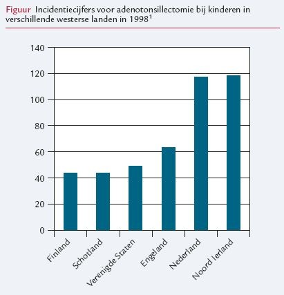 Tonsillectomie, al dan niet gecombineerd met adenotomie, is een van de vaakst uitgevoerde operaties bij kinderen. Jaarlijks verwijst een huisarts ongeveer 5 kinderen naar de KNO-arts voor een (beoordeling van de noodzaak tot) adenotonsillectomie; in 1998, bijvoorbeeld, verwijderde deze bij 33.000 kinderen in Nederland de neus- en keelamandelen, wat neerkomt op 115 ingrepen per 10.000 kinderen. Dat is meer dan in andere westerse landen: in Engeland verrichtte men 65 ingrepen en in Amerika 50 ingrepen per 10.000 kinderen (figuur).1 Voor een deel kan dit verschil te wijten zijn aan een cultureel bepaalde voorkeur voor chirurgische dan wel antibiotische behandeling van bovensteluchtweginfecties, voor een ander deel komt het door het ontbreken van internationaal geaccepteerde richtlijnen omtrent de indicaties voor adenotonsillectomie (ATE).