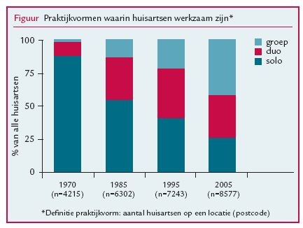 Een arts die in 1970 een huisartsenpraktijk begon, deed dit vrijwel altijd in een solopraktijk. Slechts 2% van alle huisartsen werkte toen in een groepspraktijk (figuur). Anno 2005 is de situatie totaal anders. Nu werkt 42% van alle huisartsen in een groepspraktijk. Ook het aantal huisartsen per groepspraktijk is in de loop der jaren toegenomen: in 1970 werkten er gemiddeld 3,53 huisartsen in een groepspraktijk, in 2005 zijn dat er 3,95.