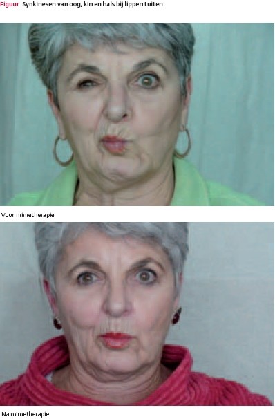 In een RCT met 50 patiënten, uitgevoerd door Beurskens et al.4,5 (2006a en b) in het Universitair Medisch Centrum Nijmegen, is aangetoond dat mimetherapie op alle domeinen van de International Classification of Functioning, Disability and Health positieve resultaten laat zien en dat deze resultaten na een jaar nog aanwezig zijn.6 Dit houdt in: op functieniveau minder asymmetrie, synkinesen en stijfheid, op activiteitenniveau minder problemen met eten, drinken en praten en op participatieniveau een betere kwaliteit van leven en beter maatschappelijk functioneren. Een systematisch literatuuroverzicht van Cardoso et al. over effecten van oefentherapie bij een idiopathische perifere aangezichtsverlamming concludeert dat het door het geringe aantal RCT’s niet mogelijk was eventuele effecten te analyseren.7