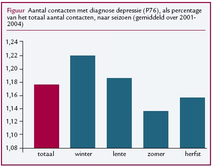 De figuur toont de verschillen tussen de seizoenen in het percentage contacten vanwege depressie. Gemiddeld is 1,2% van alle contacten gerelateerd aan de diagnose depressie. Het gemiddelde aantal contacten met betrekking tot depressie is het laagst in de zomer en het hoogst in de winter. Dit verschil is in absolute zin niet groot, maar wel statistisch significant.