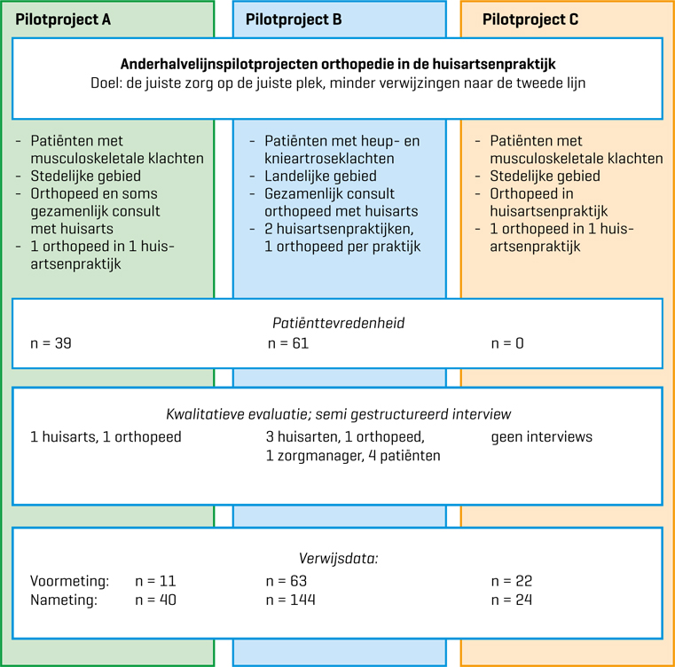 De anderhalvelijnsprojecten waren gericht op klachten van het bewegingsapparaat of specifiek op knie- en heupartrose. Het doel van alle projecten was het waarborgen van de toegankelijkheid van de zorg in de tweede lijn. Samen met zorgverzekeraar CZ hebben wij de anderhalvelijnszorg voor knie- en heupartrose geëvalueerd. Drie van de lopende pilotprojecten waren bereid mee te doen. We onderzochten de factoren die de anderhalvelijnszorg belemmerden en bevorderden, de patiënttevredenheid en het aantal verwijzingen naar de tweedelijnszorg. Meer informatie over de individuele pilotprojecten is te vinden in het stroomdiagram [figuur]. De methode van de evaluatie is beschreven in het [kader]. Details over het onderzoek zijn te vinden in de oorspronkelijke publicatie.