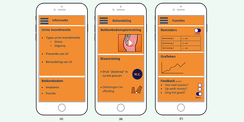 Urine-incontinentie komt voor bij 1 op de 3 vrouwen, van wie een groot deel het lastig vindt om hulp te vragen.1 De meest voorkomende soorten zijn stress-, aandrang- en gemengde incontinentie. Bekkenbodemspieroefeningen en blaastraining zijn effectieve (70-95%) maar ook intensieve behandelingen en het effect is afhankelijk van therapietrouw.2 Een app voor zelfmanagement van urine-incontinentie kan een laagdrempelig alternatief bieden en mogelijk therapietrouw verbeteren. Inmiddels zijn er al meer dan 100 apps voor urine-incontinentie. Die richten zich echter vooral op stressincontinentie en hun werkzaamheid is nauwelijks onderzocht.3