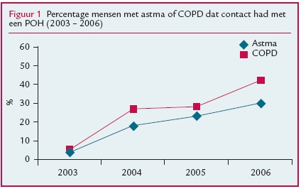 Het aantal astma- en COPD-patiënten dat contact heeft met een POH is de afgelopen jaren flink toegenomen. Zes jaar geleden gaf 4% van de astmapatiënten en 6% van de COPD-patiënten aan dat zij contact hebben met de praktijkondersteuner. In 2006 waren deze aantallen toegenomen tot respectievelijk 30% en 42% (figuur 1). Tegelijkertijd daalde het aantal zelfgerapporteerde contacten met de huisarts over de periode 2001-2006 van gemiddeld 6 naar 4,5 voor astmapatiënten en van 6,5 naar circa 5 voor COPD-patiënten. Of deze daling direct verband houdt met het hogere percentage contacten met de praktijkondersteuner, is op basis van onze huidige gegevens niet duidelijk.