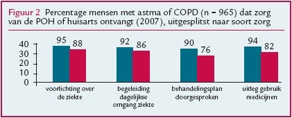 Mensen met astma of COPD zeggen de zorg te ontvangen die men op basis van de taakverschuiving van huisarts naar POH mag verwachten. Astma- en COPD-patiënten verschillen daarbij nauwelijks in hun ervaringen. Bijna alle patiënten geven aan dat de POH voorlichting geeft over hun ziekte (95%) en over het gebruik van medicijnen (94%). Bij 92% van de patiënten biedt de POH begeleiding bij de dagelijkse omgang met de ziekte. Met 90% van de patiënten bespreekt de POH het behandelingsplan. Deze percentages liggen hoger dan bij de huisarts (figuur 2), al hebben patiënten ook met de huisarts positieve ervaringen als het om voorlichting en begeleiding gaat. Wel ervaren zij de zorg van een POH als toegankelijker. Zowel astma- als COPD-patiënten geven aan dat de praktijkondersteuner meer tijd voor hen heeft en de wachttijden over het algemeen korter zijn. Zij zijn zeer tevreden over de POH.