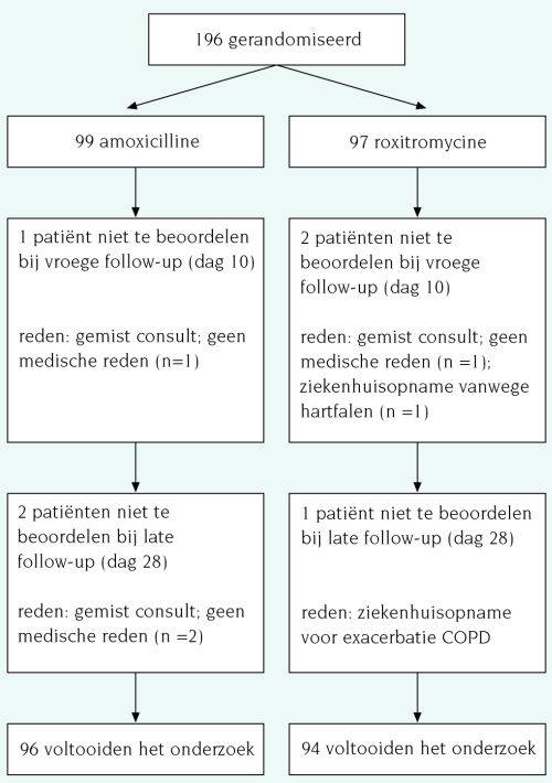 Volgens de eindbeoordeling van de huisartsen bestond er op dag 28 geen significant verschil in klinische-genezingspercentages tussen beide groepen, al was het percentage patiënten met een afname van klachten in de amoxicillinegroep significant hoger dan in de roxitromycinegroep ( tabel 3). Ook hier lagen de genezingspercentages veel lager wanneer de strengere definitie van genezing werd gehanteerd. Volgens de huisartsen (eindconclusie) waren 11 patiënten in de amoxicillinegroep en 8 patiënten in de roxitromycinegroep na 28 dagen klinisch niet genezen. Van deze patiënten herstelden er 10 (5 in elke groep) hierna snel of consulteerden hun arts niet meer voor deze klacht. Negen patiënten (6 amoxicilline, 3 roxitromycine) met een COPD-exacerbatie keerden langzaam terug naar de klinische toestand die zij vóór de exacerbatie hadden. Bij 4 patiënten (3 amoxicilline, 1 roxitromycine) werd longkanker vastgesteld. Bij één van hen werd een curatieve bilobectomie verricht. De andere 3 patiënten werden palliatief behandeld.