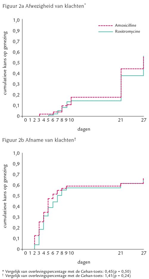 De tijd tot de klachten verdwenen, was volgens de patiëntendagboeken gelijk voor de twee onderzoeksgroepen ( figuren 2a en 2b). Het percentage patiënten dat de dagelijkse activiteiten geheel achterwege gelaten had, werd in het verloop van de tijd gevolgd. Op dag 1 had meer dan de helft van de patiënten in de amoxicillinegroep en minder dan 40% van de patiënten in de roxitromycinegroep de dagelijkse bezigheden geheel gestaakt. Dit percentage was in beide groepen op dag 10 gedaald tot onder 20% en op dag 28 tot onder 10%. De verschillen tussen de amoxicilline- en de roxitromycinegroep waren niet significant. Het percentage patiënten dat de dagelijkse bezigheden gedeeltelijk had gestaakt daalde in beide behandelgroepen geleidelijk van ongeveer 75% op dag 1 tot 30% op dag 10 en 20% op dag 28.
