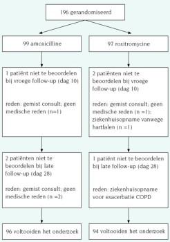 Na afname van de monsters werden de patiënten aselect toegewezen aan orale behandeling met ofwel driemaal daags 500 mg amoxicilline gedurende 10 dagen ofwel eenmaal daags 300 mg roxitromycine gedurende 10 dagen. Met een computerprogramma werd centraal voor elke deelnemende instelling een randomisatielijst klaargemaakt. Met behulp van een double-dummy-techniek werden patiënten, behandelend artsen en onderzoekers voor de toegewezen medicatie geblindeerd. Dit was noodzakelijk omdat doseringsschema's van amoxicilline en roxitromycine van elkaar verschillen (driemaal daags versus eenmaal daags) en deze middelen er niet hetzelfde uitzien (capsule versus tablet). Alle capsules en tabletten waren gelijk van uiterlijk en smaak. De therapietrouw werd gemeten met Medical Event Monitoring Systems (MEMS). Dit is een elektronisch registratiesysteem waarmee frequentie en tijdstip van inname van orale medicatie worden vastgelegd.30