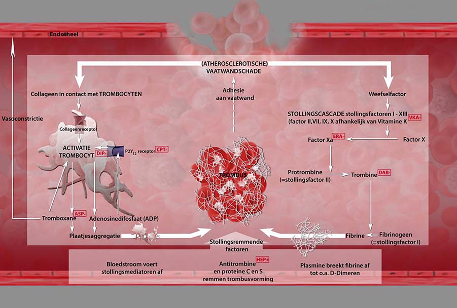 Trombocytenaggregatie enerzijds en vorming van fibrinedraden via de stollingsfactoren anderzijds leiden tot een stabiel stolsel. Elk antitrombotisch medicament grijpt aan via een van deze twee systemen.