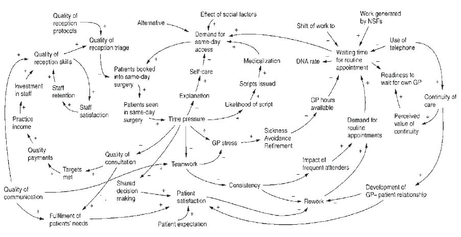 Dat de zorg complex is en kleine veranderingen soms grote gevolgen hebben (of grote veranderingen slechts kleine) lijkt me weinig nieuws. Toch hebben zowel politici, zorgverzekeraars als gewone dokters soms een wat al te simplistisch beeld van de maakbaarheid van complexe systemen. Net als het boek Complexity for clinicians, dat Wim van Geldrop hierboven bespreekt, gaat dit boek uit van de chaostheorie. De 28 hoofdstukken zijn verdeeld in 7 secties. De eerste vier zijn het interessantst: een basisuitleg over complexiteit, een sectie over organisaties als lerende systemen, een sectie over complexiteit, cultuur en leiderschap en een over het nauwelijks vertaalbare begrip emerging. Met dat laatste bedoelen de auteurs het proces van stimuleren van nieuwe en onverwachte ontwikkelingen. De laatste drie secties gaan wel heel specifiek over de NHS en persoonlijke ervaringen van auteurs met veranderingen van hun eigen systemen (zoals een verzorgingshuis, opnameplanningsystemen en buurtbeheer). In een hoofdstuk wordt precies uiteengerafeld hoe ingewikkeld de veranderingen in een afspraakplanning in een grote huisartsenpraktijk zijn. Hoewel zo’n figuur je wanhopig maakt, maakt zo’n plaatje precies duidelijk dat veranderen in de zorg heel wat ingewikkelder is dan even snel iets doen.