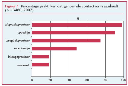 Colofon In 2007 is voor de actualisering van de huisartsenregistratie van het NIVEL een landelijke vragenlijst uitgezet onder alle 4.350 huisartsenpraktijken in Nederland (respons 80%). Wij vroegen hen naar de contactmogelijkheden die zij patiënten in 2007 aanboden: afspraakspreekuur, inloopspreekuur, terugbelspreekuur, e-consult, spoedlijn en een receptenlijn. Zie ook www.nivel.nl/beroepenindezorg.