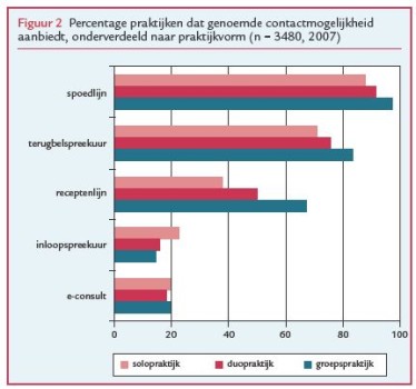 Het inloopspreekuur is definitief verdrongen door het afspraakspreekuur (figuur 1). Had tien jaar geleden 30% van de praktijken nog een inloopspreekuur, nu bedraagt dat percentage 18. Driekwart van de praktijken heeft een terugbelspreekuur. Verder heeft 90% een spoedlijn en de helft een receptenlijn. Ruim eenderde van de huisartsenpraktijken heeft zowel een afspraakspreekuur, een terugbelspreekuur, een spoedlijn en een receptenlijn. Andere combinaties komen minder vaak voor. Iets minder dan eenvijfde van de huisartsenpraktijken biedt patiënten de mogelijkheid van een e-consult aan.