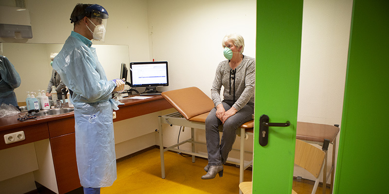 Milde COVID-19 kan zich presenteren met minder kenmerkende symptomen, die ook bij andere aandoeningen veel voorkomen. Van de vrouw op de foto was op dat moment onbekend of zij COVID-19 had.