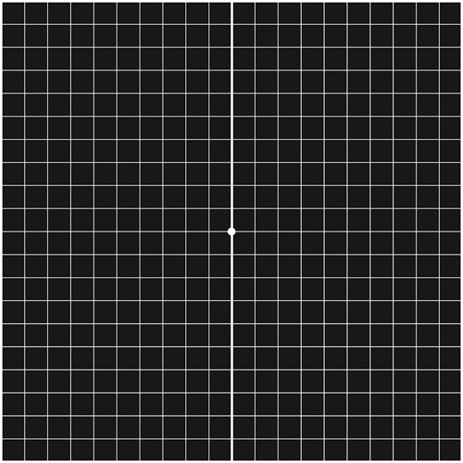 De amslertest gebruikt een kaartje met een ruitjespatroon van lijnen op vaste afstanden en een centraal gat of punt [figuur 1]. Er zijn 7 verschillende amslerkaarten en de literatuur is niet eenduidig over welke versie het betrouwbaarst is.514 Naast het originele kaartje, dat zwart is met witte lijnen, is er ook een witte versie in omloop met zwarte lijnen [figuur 2], waardoor het voor de patiënt makkelijker is de afwijkingen na te tekenen, en een versie met een diagonaal kruis, die als voordeel heeft dat de patiënt gemakkelijker centraal kan fixeren [figuur 3]. Onze voorkeur gaat uit naar de originele kaart.