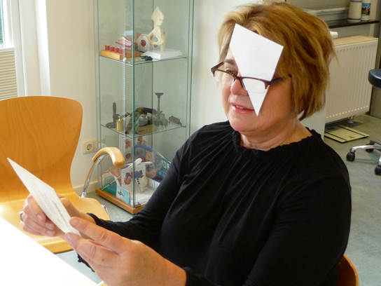 De betrouwbaarheid van de amslertest hangt duidelijk samen met een juiste instructie en uitvoering. Uit onderzoek is gebleken dat maar de helft van de patiënten de test thuis adequaat uitvoert.6 De uitvoering verloopt als volgt [kader].