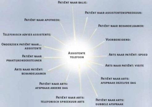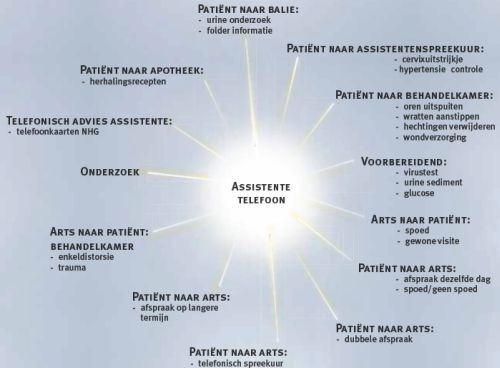 Voorafgaand aan de training van de assistentes bespreken huisartsen en assistentes in separate workshops het doel van de training. Er wordt stilgestaan bij verwachtingen en twijfels. De huidige instroom van patiënten in de praktijk wordt in kaart gebracht met behulp van een ‘zonnetje’. (Zie linksonder voor een model. Rechtsonder is een voorbeeld gegeven van een ingevuld zonnetje.) Huisartsen én assistentes gaan na aan welke randvoorwaarden de praktijk moet voldoen om de assistentes op verantwoorde wijze deze sturende rol te geven. Ook is er aandacht voor het afstemmen van de praktijkafspraken.