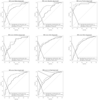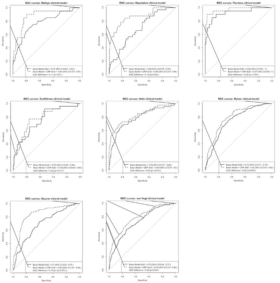 Discriminatie betreft de mate waarin een model onderscheid maakt tussen patiënten met de ziekte en patiënten zonder de ziekte. Indien de discriminatie bij het uitgebreide model toegenomen is in vergelijking met het basismodel spreekt men van een verbetering (in dit geval een toegevoegde waarde van CRP). In de (acht verschillende) datasets verbeterde de discriminatie na het toevoegen van CRP aan het predictiemodel, met een gemiddelde toename van de oppervlakte onder de receiver operating characteristic curve (een plot van sensitiviteit tegen 1-specificiteit) (Engels: area under the ROC curve, afgekort AUC) van 0,075 (variërend tussen 0,02 en 0,18). Dit is een significante, maar wel zeer kleine toename.25 In [figuur 1] zijn voor de acht datasets de twee verschillende ROC-curves te zien. Het verschil in AUC (afgekort met ΔAUC) is gevisualiseerd in een forest-plot [figuur 2], waarbij van boven naar beneden eerst de ΔAUC per dataset te zien is, en onderaan de gepoolde ΔAUC, die de gemiddelde verbetering in discriminatie toont na het toevoegen van CRP aan het diagnostisch model.