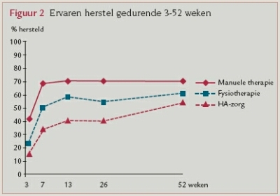 De manuele-therapiegroep verbeterde op vrijwel alle effectmaten het meest, gevolgd door de fysiotherapiegroep, die weer iets meer verbeterde dan de huisartsengroep ( tabel 3). De metingen na 3 weken en 26 weken volgen eenzelfde trend.