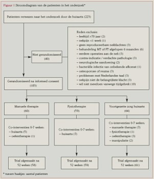 De behandeling door de huisarts vertoonde overeenkomsten met de NHG-Standaard Lage-rugpijn14 en bestond uit het geven van voorlichting over de klachten, de te verwachten prognose en factoren (inclusief psychosociale) die de klachten verergeren. Patiënten kregen adviezen over zelfhulpmiddelen (warmteapplicaties), oefeningen en ergonomische aanpassingen (kussen, houding). Daarnaast ontvingen patiënten een voorlichtingsboekje Denekschool15 met informatie over nekklachten, oefeningen en ergonomische adviezen. Zonodig werd paracetamol of een NSAID voorgeschreven op een tijdcontingente basis. Indien nodig kon iedere twee weken een consult van tien minuten plaatsvinden bij de huisarts. Verwijzingen gedurende de interventieperiode werden sterk ontraden.