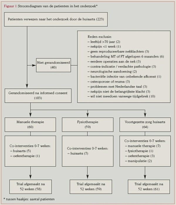 Van de in totaal 223 patiënten die naar de onderzoekscentra werden verwezen, namen we 183 patiënten in het onderzoek op: 60 patiënten werden toegewezen aan manuele therapie, 59 aan fysiotherapie en 64 patiënten ontvingen gecontinueerde zorg door de huisarts ( figuur 1). De gemiddelde leeftijd van de patiënten was 45 jaar en ongeveer 60% was vrouw ( tabel 1). De helft van de patiënten had kortdurend klachten (minder dan 7 weken) en meer dan de helft van de patiënten had al eerder een episode van nekklachten doorgemaakt. Na randomisatie waren er enkele kleine niet-significante verschillen tussen de interventiegroepen ( tabel 1).