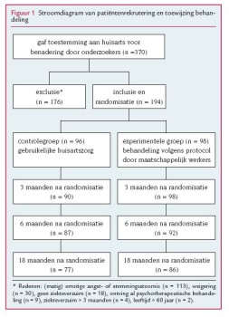 - De patiënten die de activerende, geprotocolleerde behandeling kregen, waren wel tevredener met de aard van de hulp, inzicht en adviezen die ze kregen dan de patiënten die de gebruikelijke huisartsenzorg kregen.