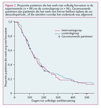 Resultaten Er waren geen significante verschillen tussen de groepen, behalve dat de experimentele groep tevredener was. In beide groepen was men gemiddeld binnen drie tot zes maanden weer opgeknapt. De duur van het ziekteverzuim was lang: gemiddeld begon men het werk pas weer gedeeltelijk te hervatten na 106 dagen (SD 87) in de interventiegroep en na 121 dagen (SD 94) in de controlegroep.
