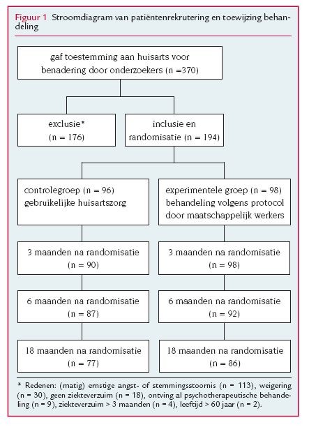 Zeventig huisartsen in Almere benaderden tussen augustus 2001 en juli 2003 patiënten voor in het onderzoek. De inclusiecriteria waren: (1) overspanning volgens huisarts en patiënt; (2) betaald werk; (3) in de ziektewet door emotionele problemen, maar niet langer dan 3 maanden (gezien de focus op de preventie van langdurig ziekteverzuim), of van plan zich direct na het consult ziek te melden; (4) tussen 18 en 60 jaar oud; (5) Nederlands sprekend. Omdat het onderzoek zich specifiek richtte op surmenagepatiënten onderzochten de onderzoekers met behulp van de CIDI7 of deze patiënten niet een ernstigere stemmingsstoornis of angststoornis hadden zoals gedefinieerd in de DSM-IV8 en ICD-10.9 Patiënten met een matig ernstige of ernstige depressieve stoornis werden van het onderzoek uitgesloten, evenals patiënten met een agorafobie, paniekstoornis of sociale fobie en patiënten die al onder psychotherapeutische behandeling waren. Mensen met een gegeneraliseerde angststoornis of een milde depressie konden wel deelnemen aan het onderzoek. Omdat we de interventie wilden testen in een heterogene groep huisartspatiënten, screenden wij hen niet op andere stoornissen dan angst en depressie. Nadat de proefpersonen geïnformeerd waren en schriftelijk verklaard hadden deel te willen nemen, lieten wij hen at random verdelen over een interventie- en een controlegroep door een secretaresse die niets van hen wist en geen contact met hen had. Bij de voormeting en drie, zes en achttien maanden daarna vulden de deelnemers een vragenlijst in. Daarnaast werden zij telefonisch geïnterviewd. De telefonische enquêteurs wisten niet wie welke behandeling kreeg, maar hebben dit mogelijk wel via de patiënt zelf vernomen. Het onderzoek is goedgekeurd door de medisch-ethische commissie van het Trimbos-instituut.