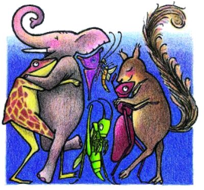 De dieren besloten middenin het bos een feest te geven. Tegen de somberheid, zeiden ze. Voor de krekel. Iedereen kwam en bracht een cadeau voor de krekel mee, alsof hij jarig was. Ze gaven hem vrolijke mutsen, dikke winterjassen, feestelijke dingen die nergens voor dienden en nog veel meer. De krekel zat in het midden achter een grote tafel. In zijn hoofd zat het sombere gevoel op een ijzeren troon en schreeuwde bevelen die onverstaanbaar waren. ‘Dank je wel, nijlpaard,’ mompelde de krekel. ‘Dank je wel, vlinder. Dank je wel, zwaan.’ Hij legde de cadeaus achter zich op de grond en leunde op de tafel. De beer had een taart meegebracht. ‘Het is een honingtaart, krekel. De lekkerste taart die ik kon bedenken,’ zei hij. ‘Maar of jij hem lekker vindt weet ik natuurlijk niet. Ik in elk geval wel.’