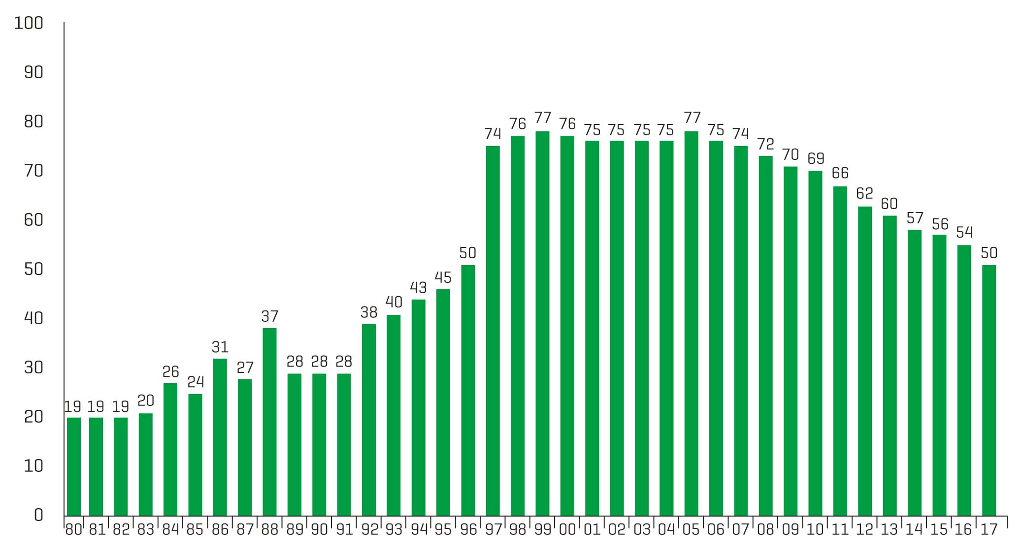 Ook in de jaren negentig van de vorige eeuw maakte de overheid zich zorgen over de lage vaccinatiegraad voor griep. Enkele influenzawetenschappers richtten de Nederlandse Influenza Stichting (NIS) op, gefinancierd door het toenmalige Ministerie van WVC en de vaccinindustrie.22 Doel was om de organisatie van de vaccinatie te verbeteren en risicogroepen actief te benaderen. De activiteiten van die stichting en de NHG-Standaard leidden in de eerste helft van de jaren negentig tot een verdubbeling van de vaccinatiegraad [figuur].23 De NIS is in 1997 wegens het behaalde succes opgeheven.