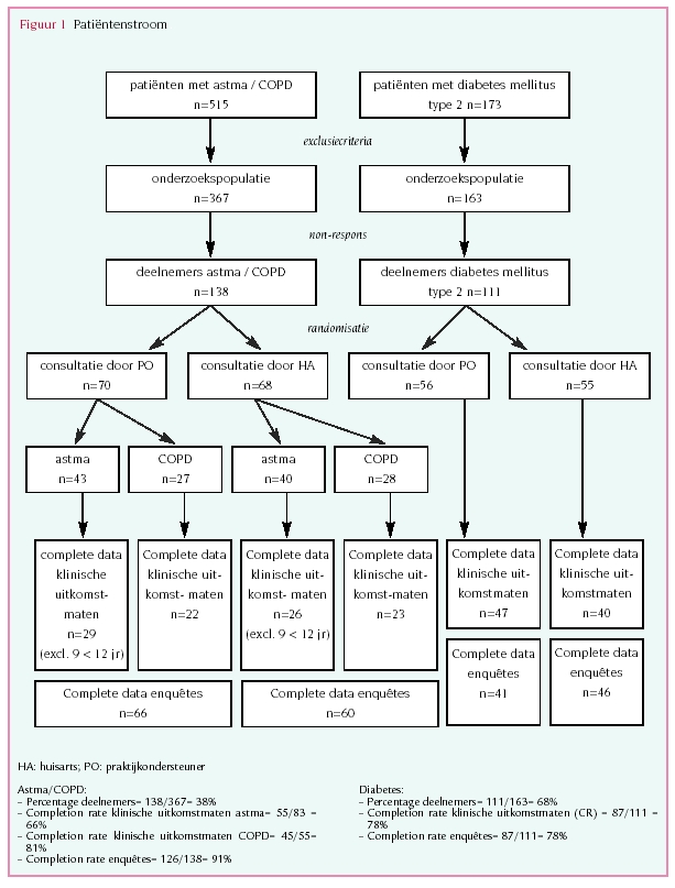 In elk van de 2 deelnemende academische gezondheidscentra (samen 7 huisartsen en circa 9000 patiënten) is een praktijkondersteuner werkzaam in de zorg voor patiënten met diabetes type 2, astma en COPD. Wij hebben bij de patiënten met astma zowel kinderen als volwassenen in het onderzoek opgenomen. De huisartsen selecteerden van januari 2000 tot april 2001 de patiënten op basis van de diagnose diabetes mellitus type 2, astma of COPD. Exclusiecriteria waren behandeling door een medisch specialist en ernstige comorbiditeit; bij diabetes kwamen daar nog de diagnose diabetes mellitus type 1 en insulinegebruik bij. Wij selecteerden de patiëntenpopulatie met behulp van het HIS en op basis van medicatie.