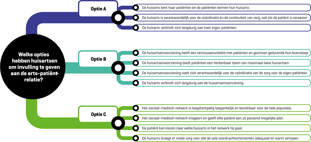 De aios op de Amsterdamse bijeenkomst leken het meest te zien in optie B. Weliswaar heeft de ‘huisartsenvoorziening’ in die optie de vertrouwensrelatie met de patiënt, maar daarbinnen heeft die patiënt toch maar twee dokters, die zich ook langdurig aan een praktijk verbinden. Koele instrumentele relaties lijken niemands streven. Net als in vrijwel alle Europese landen zweren patiënten bij ‘hun’ huisarts en huisartsen bij ‘hun’ patiënten. Ik denk dat ook deze kernwaarde na zestig jaar waarschijnlijk nog wel even blijft bestaan.
