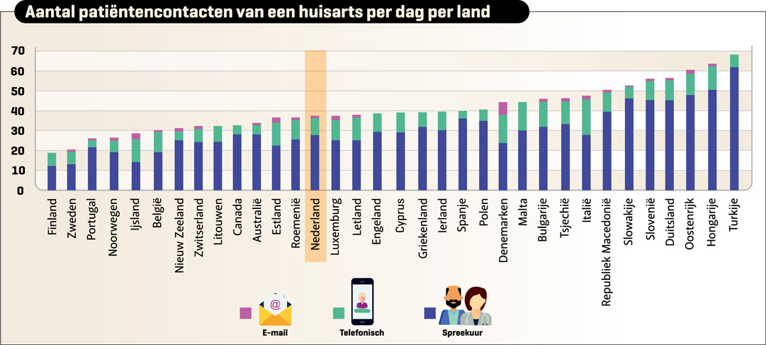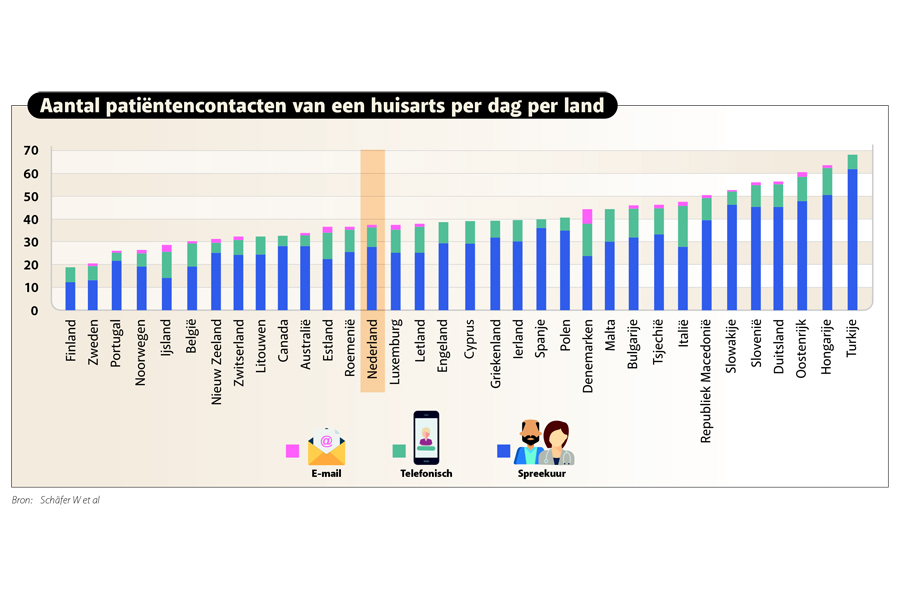 De aard van de contacten is veranderd. De consulten duren zeker langer dan in de jaren zestig. [Figuur 2] laat zien dat het aantal lange consulten en visites (> 20 minuten) de afgelopen jaren behoorlijk is gestegen. Wel is er enige vertekening omdat het NIVEL de contacten met de poh-ggz bij de huisarts optelt. Die contacten duren altijd al 20 minuten. Gemiddeld zijn de contacten met de huisarts in vergelijking met bijvoorbeeld Finland nog steeds kort (11 minuten versus 24). In 2001 is was de gemiddelde consulttijd net een minuutje korter, maar ook toen al duurde 40% van de consulten langer dan 10 minuten. In vergelijking met andere landen zitten Nederlandse dokters een beetje in de middenmoot qua aantal patiëntencontacten per dag, namelijk 28 consulten, acht telefoontjes en één e-mailconsult ([Figuur 3]).3 Huisartsen hebben gemiddeld 32 direct patiëntgebonden uren per week om die arts-patiëntrelatie te onderhouden.