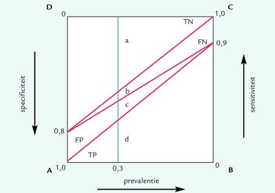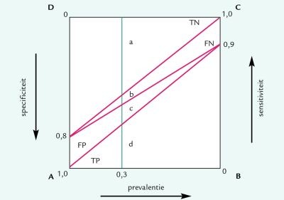 Het hanteren van het besliskundig en epidemiologisch begrippenkader gaat lang niet iedereen gemakkelijk af. Hoewel elke arts bekend zal zijn met termen als sensitiviteit, specificiteit en voorspellende waarde, blijkt het moeilijk daarmee te werken. De termen worden vaak – ook in de literatuur – verward of verkeerd gebruikt. 3 Bij een poging tot uitleg door experts aan de hand van de formule van Bayes, slaat meestal de wanhoop toe. De algebraïsche formule, hoewel inzichtelijk voor wiskundigen, blijkt hoofdbrekens op te leveren en is op zijn minst niet gebruiksvriendelijk. Door ons is al eerder een model aangereikt om in dit manco te voorzien. 4 Mensen denken gemakkelijker in beelden dan in formules. 5 Het theorema van Bayes in meetkundige vorm blijkt veel toegankelijker dan de algebraïsche formule. Uit figuur 1 is gemakkelijk af te lezen hoe (terecht en fout-)negatieve en positieve testuitslagen zich tot elkaar verhouden (de lengte van de lijnstukken), gegeven een bepaalde sensitiviteit, specificiteit en prevalentie. Tevens kan zichtbaar worden gemaakt hoe verandering van prevalentie leidt tot verandering in deze verhoudingen. Tijdens het lezen van een onderzoeksverslag zou de lezer een testdiagram kunnen tekenen om het betoog gemakkelijker te kunnen volgen. Tevens worden daarmee onjuistheden of ontbrekende gegevens in dat betoog opgespoord.