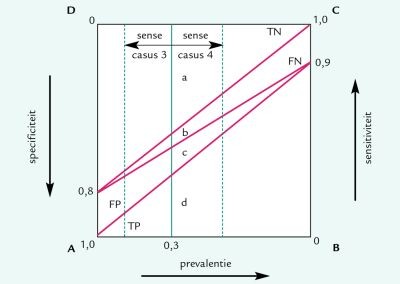 Bij voorafkansen op ziekte gebaseerd op epidemiologische gegevens behoort een getal. Dat getal is nodig om te kunnen rekenen. In het testdiagram is het getal het punt tussen 0 en 100 (%) op de x-as, waar de loodlijn wordt getrokken. Dit science-getal is gebaseerd op het vóórkomen van de ziekte in een bepaalde populatie. Het sense-getal zal nooit bekend zijn. Het zal altijd om een niet te kwantificeren inschatting gaan. Daardoor valt er moeilijk mee te rekenen. Wat wel kan, is aangeven of de science-loodlijn op grond van sense-argumenten naar links of naar rechts moet worden geschoven, zoals aangegeven in figuur 2. ‘Onwaarschijnlijk’ wordt daardoor bijvoorbeeld ‘nog onwaarschijnlijker’. Voor casus 3 (loodlijn schuift naar links) kan dit tot gevolg hebben dat de klachten en symptomen eerder als fout-positief dan als terecht-positief worden geduid en dat de patiënt wordt gerustgesteld zonder verder onderzoek. Voor casus 4 zou het ontbreken van bepaalde symptomen eerder als fout-negatief dan als terecht negatief worden ingeschat, waarna aanvullend medisch onderzoek volgt. De winst van het gebruik van het diagram is vooral gelegen in de mogelijkheid sense-sciencedenken te verwoorden en te verbeelden.
