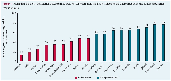 Een belangrijk kenmerk van een systeem van gezondheidszorg is de mate van toegankelijkheid van onderdelen van dat systeem. In sommige landen vormt de huisarts de toegangspoort; in andere landen is vrijwel elk onderdeel van het systeem direct – dus zonder verwijzing of recept – toegankelijk. Toegankelijkheid is belangrijk omdat de vraag naar zorg op verschillende wijze bepaald wordt: de behoeften en wensen van patiënten bepalen namelijk het beroep op zorg van direct toegankelijke zorgverleners, terwijl beslissingen van zorgverleners het beslag op de indirect toegankelijke zorg bepalen. In eigen onderzoek van de auteurs is de mate van toegankelijkheid van zorg in een aantal Europese landen vastgesteld; sleutelpersonen gaven van 17 medische, verpleegkundige en paramedische beroepen aan of de toegang voor het publiek rechtstreeks verliep of via een verwijzing of voorschrift. Beroepen varieerden van huisarts en wijkverpleegkundigen tot anesthesioloog en revalidatiearts. De maximale score was 17. Griekenland en Zweden zijn de landen met de meest direct toegankelijke zorg en Portugal is het land met de minst toegankelijke zorg. Nederland zit precies in het midden, 7 van de 17 beroepen of voorzieningen zijn rechtstreeks toegankelijk. De gezondheidszorgsystemen waar de huisartsen een poortwachtersfunctie vervullen, staan vermeld in de linker helft van figuur 1. Daar is de gezondheidszorg in het algemeen minder toegankelijk. 13