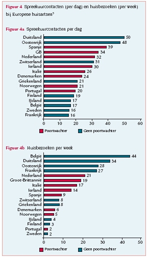 Uit het onderzoek van Boerma en Fleming uit 1993 blijkt dat Duitse huisartsen het grootste aantal patiënten op hun spreekuur zien tijdens een werkdag en dat de Belgische huisarts Europees kampioen huisbezoek is ( figuur 4). De Nederlandse huisarts zit zowel wat betreft spreekuurcontacten als huisbezoeken bij de bovenste 5 (van de 17 Europese landen waarmee Nederland wordt vergeleken). Er is geen duidelijke relatie met het zorgsysteem. Men zou verwachten dat honorering per verrichting meer contacten oplevert dan salaris of abonnement. Dit blijkt echter niet het geval te zijn, ook niet als rekening gehouden wordt met het aantal inwoners per huisarts.