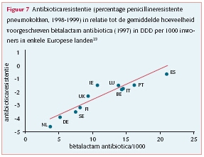 De Nederlandse huisarts is internationaal gezien, terughoudend in het voorschrijven van geneesmiddelen. Het is bijvoorbeeld in Nederland geen vaste gewoonte om ieder consult met een recept af te sluiten. Waar men in Frankrijk bij 9 van de 10 consulten de huisartsenpraktijk met een recept verlaat, 21 is dat bij ons slechts in 57% van de consulten het geval. 22 Kooiker en Van der Wijst23 laten zien dat ook voor alledaagse klachten zoals hoofdpijn, buikpijn en diarree Belgen veel vaker een geneesmiddel slikken dan Nederlanders. Deze algemene terughoudendheid komt ook tot uitdrukking bij het voorschrijven van antibiotica. Dit blijkt uit een onderzoek onder de lidstaten van de Europese Unie van Bronzwaer, 23 waaruit bleek ( figuur 7) dat in Nederland de kleinste hoeveelheid antibiotica wordt omgezet (in Spanje de hoogste) en, dat – belangrijker nog – ook de antibioticaresistentie het laagst is: een hoog antibioticagebruik levert zoals bekend meer antibioticaresistentie op.