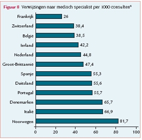 Ook zijn er geen recente internationale gegevens voorhanden over verwijzingen van huisartsen naar medisch specialisten. We moeten ons baseren op het proefschrift van Fleming6 waarin gegevens uit het begin van de jaren negentig zijn gebruikt. Noorwegen had het grootste aandeel verwijzingen, Frankrijk het kleinste. Nederland zat iets onder het midden ( figuur 8). De Nederlandse huisartsen lieten zich het meest beïnvloeden door de wens van de patiënt om een verwijzing uit te schrijven. Bijna 60% van de verwijzingen werd op verzoek van de patiënt geschreven. Vooral in Zuid-Europa zei men minder gevoelig te zijn voor druk vanuit de patiënt: 30-40% van de verwijzingen was op verzoek van de patiënt. Na de verwijzing kon de patiënt in Frankrijk, Duitsland en België het snelst terecht bij de specialist (gemiddeld ongeveer 7 dagen); in Nederland kostte dat destijds ongeveer 11 dagen. In Noorwegen en Groot-Brittannië duurde het ruim een maand voordat men bij de specialist terechtkon.