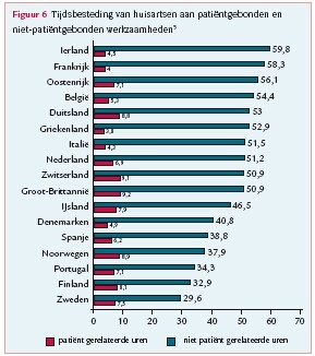 Voor de omvang van de werkweek maken we gebruik van gegevens uit het proefschrift van Boerma. 4 In figuur 6 zijn zowel het aantal patiëntgebonden uren per week weergegeven als de totale werktijd. De avond- en weekenddiensten zijn niet meegeteld. Als men gedurende het weekend werkte – in veel landen hebben huisartsen ook op zaterdag spreekuur – is deze tijd weer wel meegeteld. Gegevens over in deeltijd werkende huisartsen zijn ongecorrigeerd meegenomen. De gegevens zijn dus niet herleid tot een fulltime werkende arts.