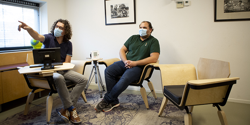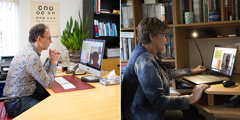 Foto | Huisarts Bart Timmers (links) in gesprek met een patiënt via beeldbellen. © Margot Scheerder