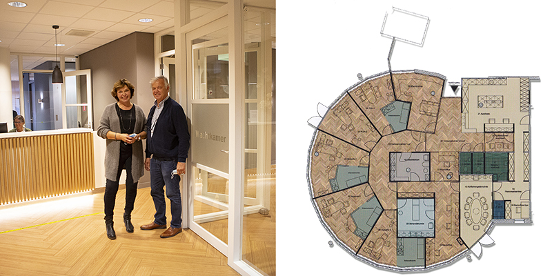 Toen de supermarkt naast de huisartsenpraktijk van Frans en Milou Buck wilde uitbreiden waren zij niet meteen enthousiast. Vier jaar voor hun geplande pensioen nog een verhuizing voor de apotheekhoudende groepspraktijk in Stolwijk? Maar tijdens het overleg met de supermarkt, het plaatselijke bouwbedrijf en de toekomstige verhuurder kregen ze een grote ronde ruimte aangeboden onder een wooncomplex voor ouderen. Dochter Sacha Donia-Buck (architect) pakte met zakelijk partner Laura van Dullemen de klus aan en maakte een ontwerp. Vijf spreekkamers langs de rand en 2 centraal goed toegankelijke ‘blokken’ voor het laboratorium en de behandelkamer vormen het rustige gedeelte. De ingang met balie, apotheek en wachtkamer zijn vrij toegankelijk voor de patiënten. Uitgangspunt bij de verbouwing waren de uitgebreide richtlijnen en adviezen van de LHV, samen met de wensen van de praktijkhouders. Via moodboards groeide het plan waarbij werd gekozen voor natuurlijke en warme materialen met een open balie zonder glas, zodat de 6350 patiënten zich welkom voelen en het grote team van meer dan 15 medewerkers prettig kan werken.
