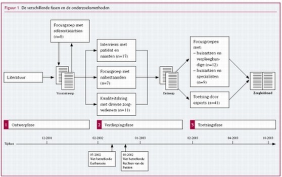 De uiteindelijke zorgleidraad was het resultaat van een integratie van literatuuronderzoek, feedback van experts uit het werkveld, kwalitatief onderzoek bij terminaal zieke patiënten en naasten, toetsing van de toepasbaarheid van de zorgleidraad in focusgroepen en een finale beoordeling door een multidisciplinair team van experts. De leidraad is ook voor Nederlandse artsen beschikbaar als boek en via de website www.zorgleidraad.be.15