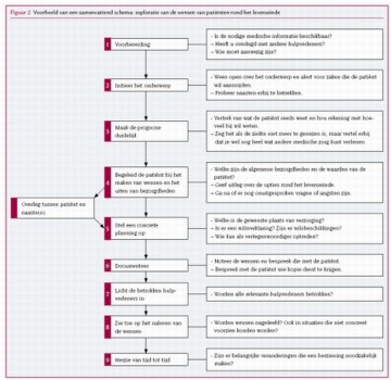 Deschepper R, Michiels E, Vander Stichele R, Bernheim JL, De Keyser E, Van Der Kelen G, Mortier F, Deliens L. De ontwikkeling van een Belgische zorgleidraad voor huisartsen over beslissingen aan het levenseinde. Huisarts Wet 2006;49(8):404-10. Inleiding In dit onderzoek beschrijven we hoe we een zorgleidraad hebben ontwikkeld voor huisartsen over communicatie met terminaal zieke patiënten die thuis willen sterven. Methoden Driefaseproces. Ontwerpfase: we hebben bevindingen uit de literatuur gestructureerd en gewogen door middel van een focusgroep met huisartsen (n=8). Verdiepingsfase: we verzamelden kwalitatieve data over het patiënten- en zorgverlenersperspectief door middel van een focusgroep van naasten (n=7), diepte-interviews met terminaal zieken (n=17) en een kwaliteitskring van zorgverleners (n=11). Toetsingsfase: we beoordeelden de aanvaardbaarheid van het voorontwerp in bipolaire focusgroepen (huisartsen-verpleegkundigen (n=12) en huisartsen-specialisten (n=9)) en commentaar per e-mail door experts (n=41). Resultaten Zorgverleners en patiënten gaven aan dat ze grote behoefte hebben aan een begrijpelijke zorgleidraad over communicatie aan het levenseinde. Ze kenden de grootste prioriteit toe aan vier thema’s: de waarheidsmededeling, exploratie van wensen rond het levenseinde, omgaan met enerzijds disproportionele behandelingen en anderzijds met euthanasieverzoeken. Andere thema’s die naar voor kwamen, waren: continuïteit van zorg door de huisarts, voeding en vocht in de stervensfase en de technische aspecten van euthanasie. Beschouwing Het bleek haalbaar om een zorgleidraad te ontwikkelen voor huisartsen op basis van de drie hoekstenen van evidence-based medicine: literatuuronderzoek, patiëntenvisies en ervaring van deskundigen. Ondanks verschillen tussen België en Nederland is deze zorgleidraad ook relevant voor Nederlandse huisartsen.