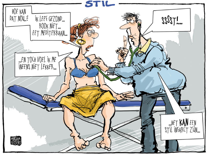 Met bijna een kwart van alle hartinfarcten heeft het stille hartinfarct en een aanzienlijke prevalentie. Klassieke cardiovasculaire risicofactoren zijn minder vaak aanwezig, maar het risico op overlijden is niet zoveel minder groot. Het is daarom aan te raden laagdrempelig een ecg laten maken wanneer een patiënt met cardiovasculaire risicofactoren bij de huisarts komt met atypische klachten – vooral wanneer het een vrouw is.