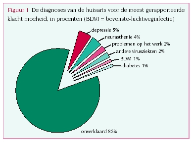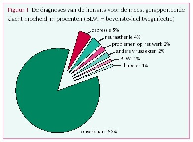 Van de oorspronkelijke 846 bellers gaf 73% informed consent voor inzage in hun dossier; 345 huisartsen verstrekten aanvullende informatie over 553 respondenten (89% van de mensen die informed consent gaven). Deze 553 respondenten rapporteerden gemiddeld 2358 klachten bij het telefonisch meldpunt (gemiddeld 4,3 per persoon), waarvan 6% niet geanalyseerd kon worden voor dit onderzoek ten gevolge van incomplete terugrapportage door de huisarts. Van de geanalyseerde 2211 gerapporteerde klachten bleek 74% bij de huisarts bekend ( tabel 1). Van de 10 bij het telefonisch meldpunt vaakst gerapporteerde klachten werd ‘geheugenstoornis’ het minst frequent (53%) aan de huisarts gerapporteerd. De meest gerapporteerde klacht ‘moeheid’ (45%) was in 80% van de gevallen ook bij de huisarts gepresenteerd. Slechts 6% van de 2211 bij het telefonisch meldpunt gepresenteerde symptomen scoorde in de categorie ‘waarschijnlijk’ of ‘zeer waarschijnlijk’ samenhangend met de ramp. Bij de meest voorkomende klacht ‘moeheid’ was dat slechts 3%. Slaapproblemen (23%) en nervositeit (18%) werden vaker ook door huisartsen als een waarschijnlijk gevolg van de ramp gezien, maar nog steeds bij een minderheid van de patiënten. Bij de 29 patiënten met een posttraumatische stressstoornis (PTSS) was er bij 72% van de patiënten een waarschijnlijke en bij 21% een mogelijke samenhang met de ramp volgens de huisarts. Soms speelden traumatische gebeurtenissen in het land van herkomst een grotere causale rol dan de Bijlmerramp. Frequent gerapporteerde klachten als die van bewegingsapparaat en huid schreven de huisartsen zelden aan de ramp toe. Vooral het tijdstip van rapporteren bij de huisarts bleek een belangrijke overweging om klachten wel of niet aan de ramp toe te schrijven. Bij nadere analyse bleek 11% van de klachten dan ook al bij de huisarts gerapporteerd te zijn vóórdat de ramp plaatsvond en 15% lang daarna, toen de media er veel aandacht aan besteedden en de parlementaire enquête plaatsvond. Slechts 33% van de klachten die respondenten aan de ramp toeschreven, was gemeld in de eerste 2 jaar na de ramp. Bij 46% van de patiënten meldde de huisarts andere psychosociale oorzaken voor de klachten, bij 30% geen duidelijke oorzaak, bij 13% een andere somatische aandoening als verklaring en bij 8% een persoonlijkheidsstoornis. Huisartsen werd gevraagd naar de meest waarschijnlijke diagnose(s) voor de gerapporteerde klachten. Dat resulteerde voor de 2211 bij het telefonisch meldpunt gerapporteerde klachten in 862 door de huisartsen gestelde diagnoses. Analyse van deze gegevens maakte duidelijk dat een klacht tot diverse diagnoses kan leiden, maar dat de klachten meestal gerekend moeten worden tot de categorie lichamelijk onverklaarde klachten (LOK). Bij de meest gerapporteerde klacht ‘moeheid’ stelden de huisartsen diverse diagnoses, zoals ‘depressie’ (5%), ‘surménage/neurasthenie’ (4%), ‘problemen op het werk’ (2%), ‘andere virusziekten’ (2%), ‘bovenste-luchtweginfectie’ (1%) en ‘diabetes mellitus’ (1%), maar in de meeste gevallen leidde deze klacht niet tot een diagnose ( figuur 1). ‘Hoofdpijn’ resulteerde vaker in een diagnose (14% ‘spanningshoofdpijn’, 3% ‘crisis/acute stress’, 3% ‘sinusitis’, 2% ‘migraine’, 2% ‘andere aandoeningen van de luchtwegen’), maar bleef ook meestal ‘hoofdpijn’ ( figuur 2).
