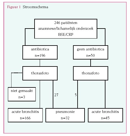 Dat er betere diagnostische middelen nodig zijn, bleek wel bij de beoordeling van de klinische diagnose van de huisartsen: er was geen relatie tussen het klinische oordeel over de aanwezigheid van pneumonie en de bevinding pneumonie volgens de referentiestandaard. De meeste traditioneel met pneumonie geassocieerde klachten en afwijkende bevindingen bij lichamelijk onderzoek (waaronder afwijkende auscultatie) bleken niet van wezenlijk belang voor het onderscheiden van pneumonie en andere LLWI's. Significante voorspellers van pneumonie waren: droge hoest, diarree, temperatuur =38 ºC en een verhoogde BSE of CRP. In de huidige onderzoekspopulatie was hoest een obligaat inclusiecriterium. Een van de belangrijkste kenmerken van patiënten met acute bronchitis is productieve hoest. Bij pneumoniepatiënten kan productieve hoest aanwezig zijn, maar vaak in een relatief laat stadium.12 Droge hoest is eenmaal eerder in een onderzoek aangetoond als voorspeller van pneumonie.13 Diarree is waarschijnlijk een para-infectieus symptoom van pneumonie, veroorzaakt door het vrijkomen van cytokinen en andere ontstekingsmediatoren. Het is beschreven als symptoom bij 10-30% van de patiënten met pneumonie.14 Diarree komt dus niet alleen voor als symptoom van een pneumonie veroorzaakt door Legionella pneumophila, Chlamydia pneumoniae, of Mycoplasma pneumoniae. Een gemeten temperatuur van =38 ºC werd in alle eerder gepubliceerde diagnostische onderzoeken naar pneumonie vastgesteld als onafhankelijke voorspeller.151617181920 Koorts als anamnestisch gegeven bleek echter geen goede vervanger van het daadwerkelijk meten van de rectale temperatuur. Mentale verwardheid had een hoge specificiteit en leek dan ook van belang als voorspeller van pneumonie, maar het geringe aantal patiënten zorgde voor een breed betrouwbaarheidsinterval. Crepitaties bleken ook in andere onderzoeken niet15162021 of onvoldoende discriminatief om pneumonie aan te tonen of uit te sluiten.1719 Hoewel de klinische diagnose pneumonie slechts bij 21 patiënten werd gesteld, werden aan 196 van de 246 patiënten antibiotica voorgeschreven. Dit betekent dat, naast de 21 patiënten bij wie aan een pneumonie werd gedacht, 175 van de overige 225 patiënten (78% met vermoede acute bronchitis) antibiotica ontvingen. Het hoge percentage antibioticagebruik bij acute bronchitis komt overeen met gegevens uit eerdere onderzoeken.222324